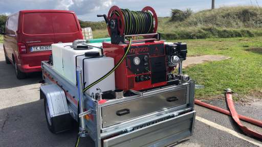 Systemet består av bensindriven högtryckspump, anpassade vattentankar, upprullnings slangsystem samt MistTech munstycken.